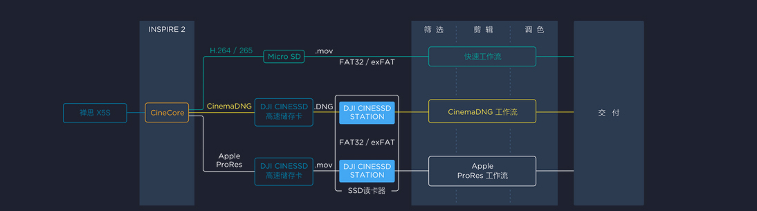 “悟”Inspire2对工作流进行了全面优化,录制过程中支持使用标准CinemaDNG以及AppleProRes格式,还可直接使用影视行业常用的后期处理软件进行处理。支持exFAX*FAT32标准文件系统,无需额外软件,通过DJICINRSSD读卡器即可直接读出素材。