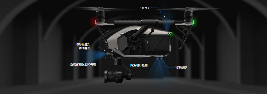 “悟”Inspire2标准前世和下视双目视觉系统,可探测30米范围内的障碍物,在障碍物感知系统开启的情况下, 依然拥有良好的机动性,最快速度可达54km/h。除此以外,Inspire2还标配有一个顶部红外感知系统,能有效感知上方5米范围内嗲事体,可以在上升过程中,大概率避免飞行器撞击顶部障碍物的情况发生。
